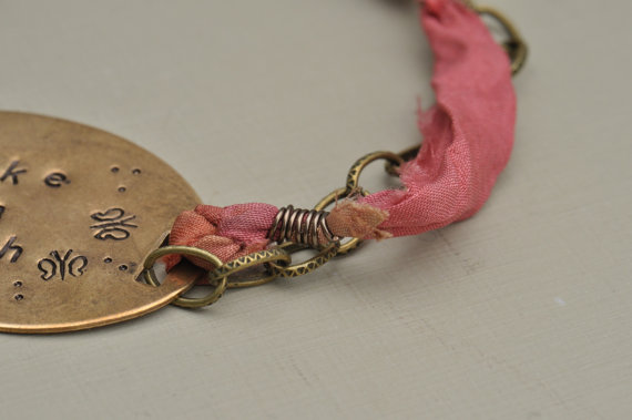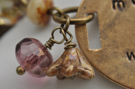 I have hand stamped a Vintaj Brass blank with the words "make a wish" and added little butterfly motifs. The bracelet is finished with one side textured bronze plated chain with a strand of sari silk ribbon in a lovely shade of antique rose pink. The other side is fully beaded with a mix of Czech glass beads in Picasso finish in shades of cream, beige, champagne and amethyst with a bronze plated filigree bead. There is also a little bouquet of Czech Picasso finish flower bead and an amethyst rondelle at the front and the bracelet is finished with a trigger clasp.