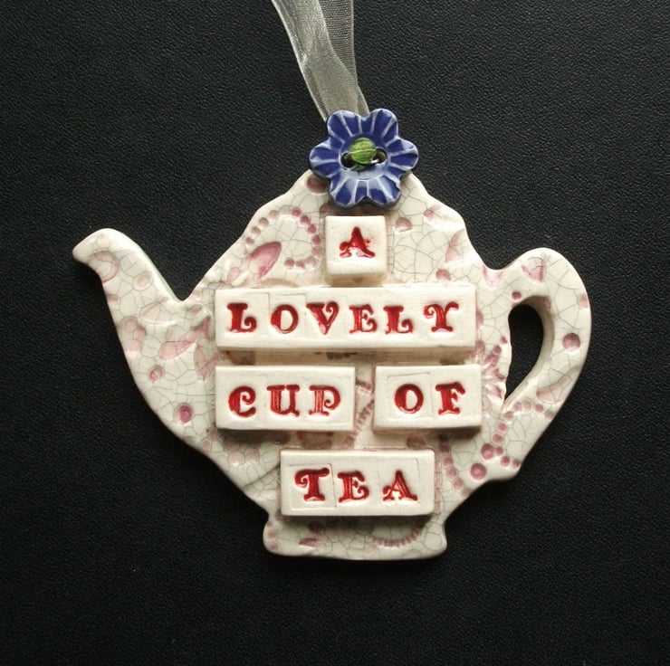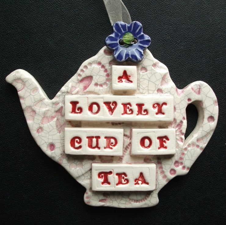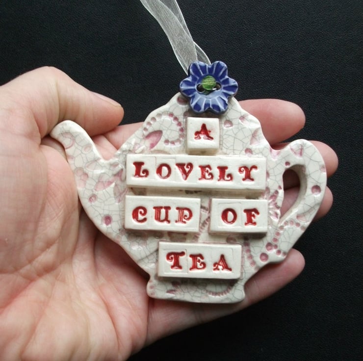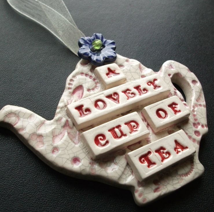 This little hanging teapot decoration is made from white earthenware clay and has the words A lovely cup of tea on it.