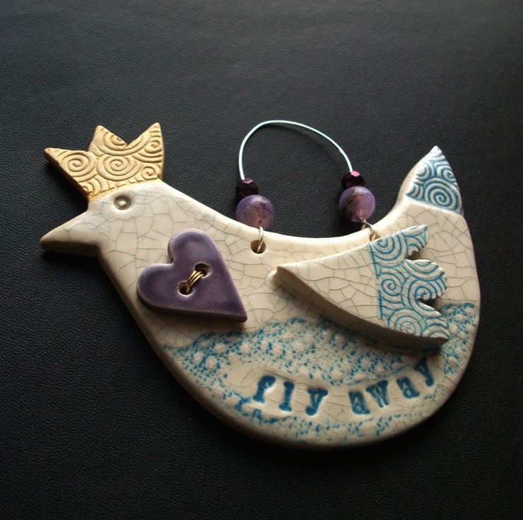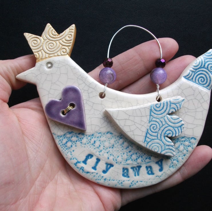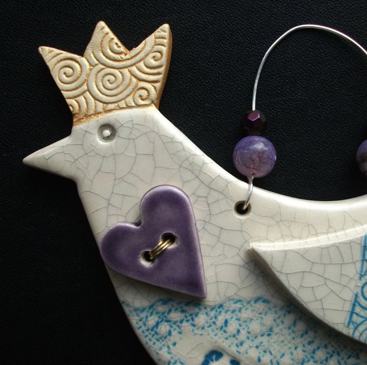 This bird decoration is hand cut from white earthenware clay and decorated with an embossed swirl. It is then twice fired to a top temperature of 1100 degrees so it is nice and strong.