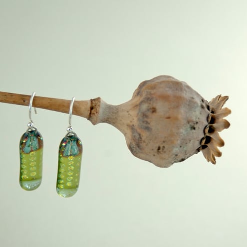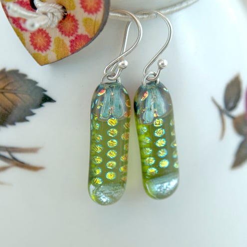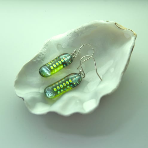 Beautiful pale green Bullseye glass earrings with spotty dichroic detail.