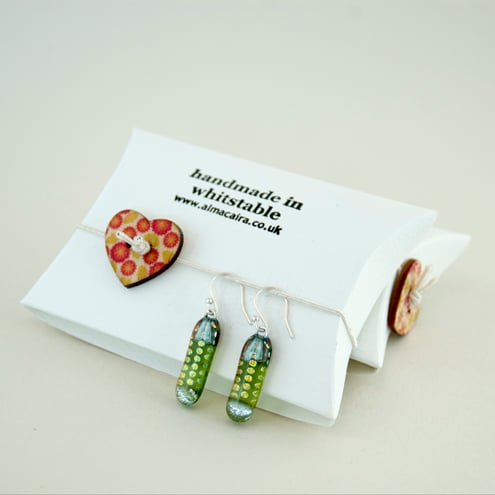 Created from layered Bullseye and dichroic glass in my Whitstable workshop. Sterling silver earwires. The dichroic glass dots shimmer and catch the light beautifully. A sterling silver wire is fused between the layered glass to add depth to the design and create a permanent bond. Supplied with a recycled card gift box (sent flat for postage but very simple to assemble).