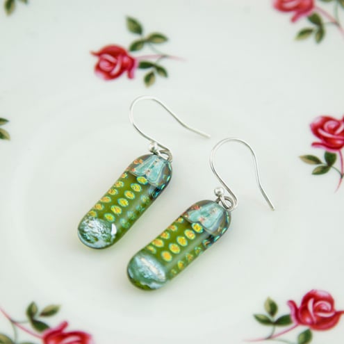 Kiln fused glass has a natural fluid quality and no two pieces are the same. Earrings are created as a matching set but there will always be slight differences between the two which I believe is an inherent part of the material’s character.