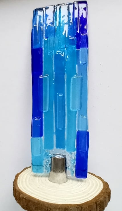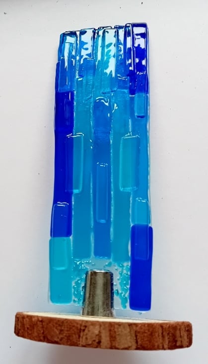 Glass panel measures approx 16cm x 5cm and is mounted a round wooden disc.
