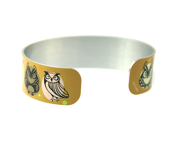 Bangle bracelet with graphically drawn owls. Women's cuff, mustard background with different coloured owls. Handcrafted jewellery, made in the UK. Ideal gift for a wildlife lover.
