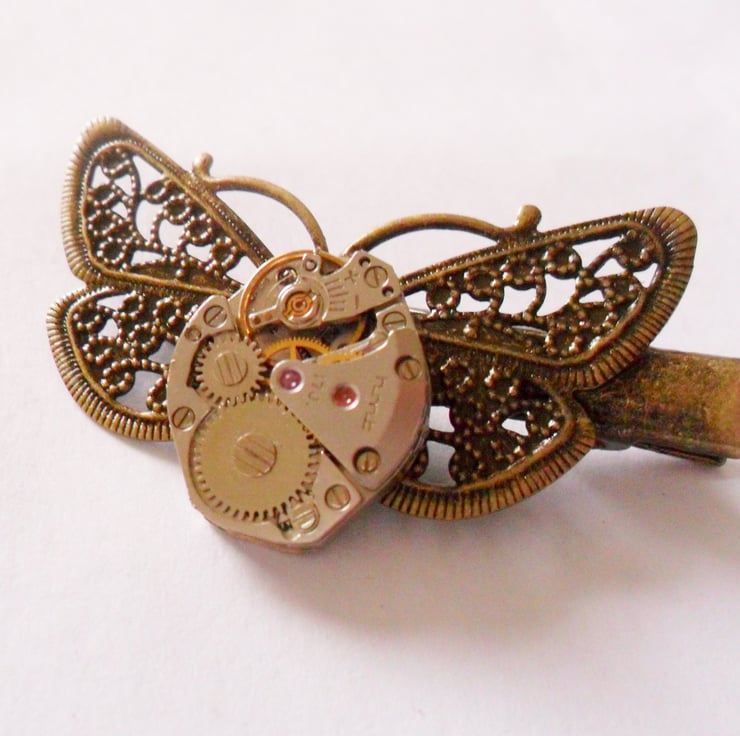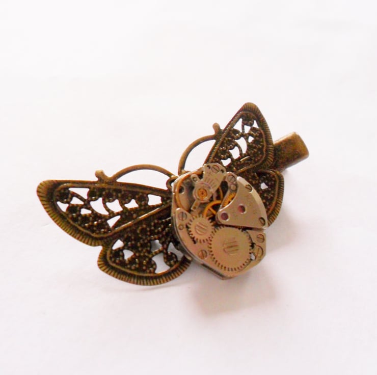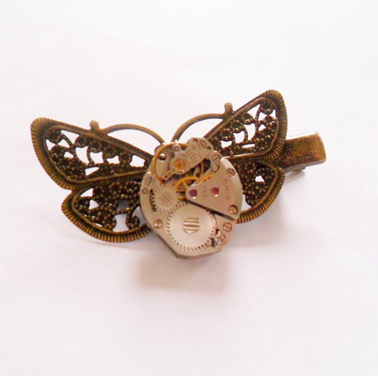 I have created this unusual hair slide from a dainty filigree butterfly base and a vintage watch movement, with all of the intricate workings visible.