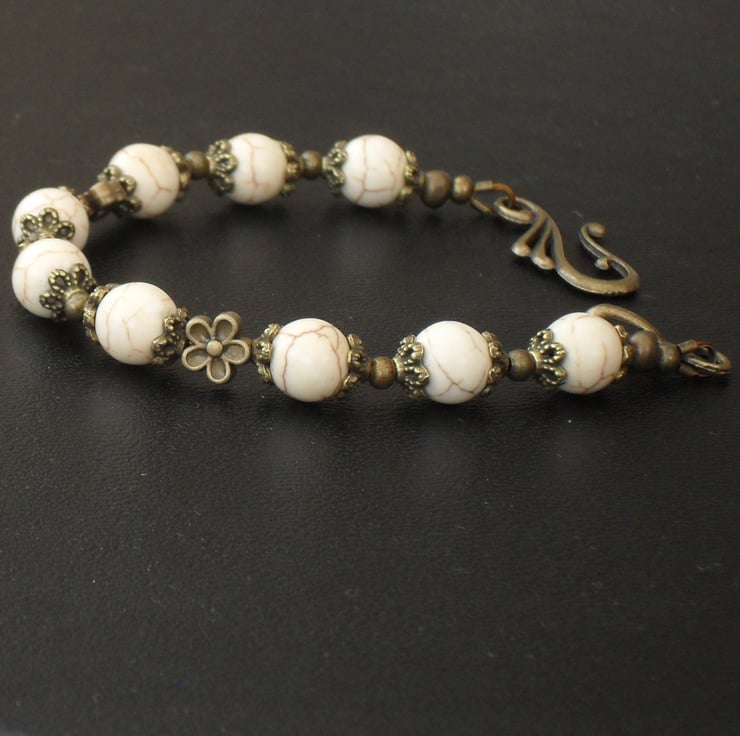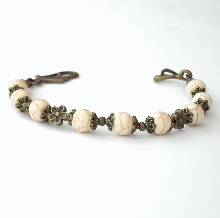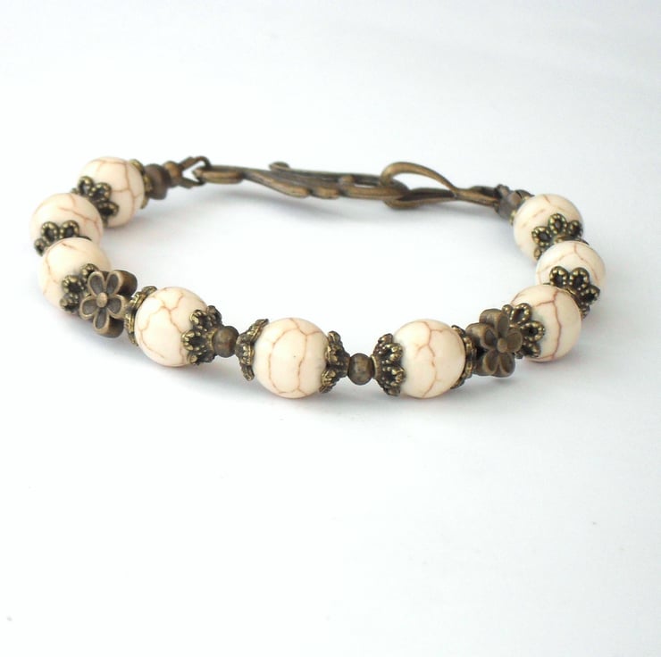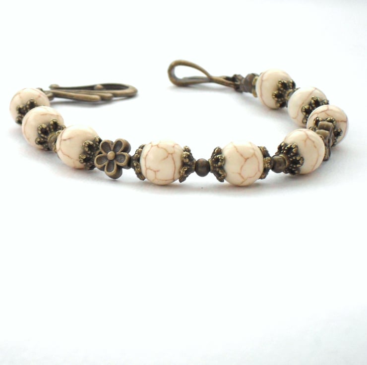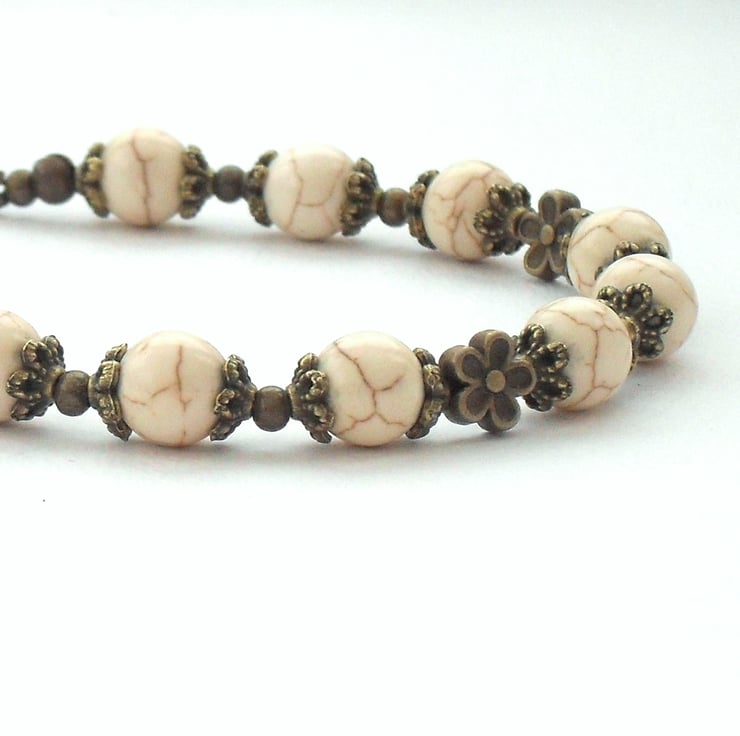 Beautiful cream magnesite 8 mm beads look great with bronze beadcaps and daisy shaped beads.