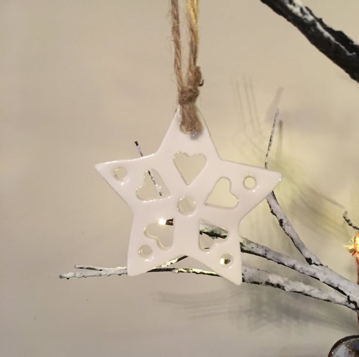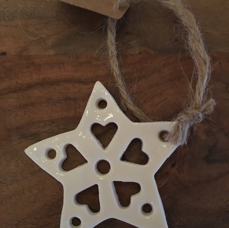 A beautiful hand made porcelain Christmas Tree Decoration made from white porcelain. The Snowflake is glazed on the front with a clear glaze and heart and circle cutouts to give a lacy effect. This beautiful decoration will be a welcome addition to any Christmas tree and is tied with natural twine for easy hanging.