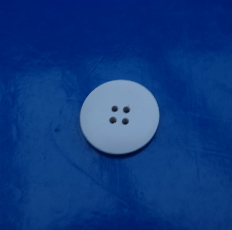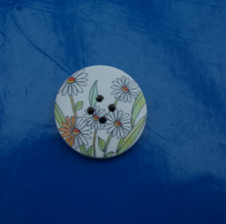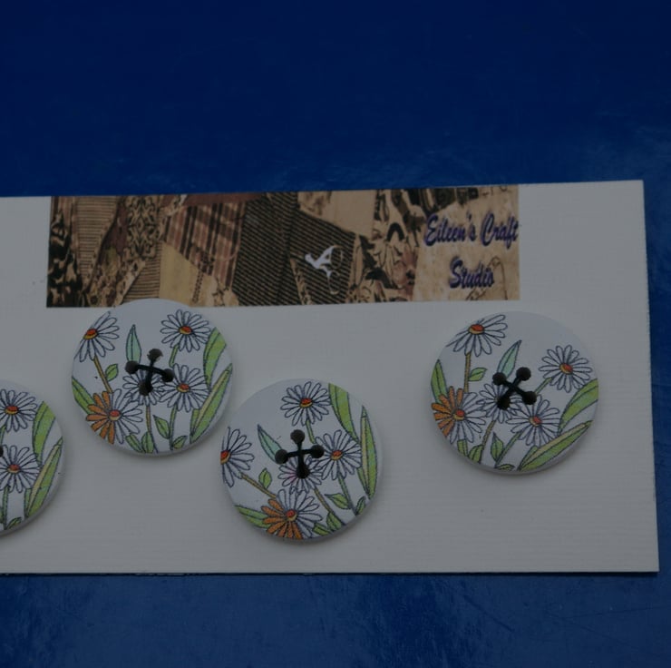 A set of 4 wooden flower printed buttons. Each individual button has been painted white then is covered in a printed design of daisies with slender green leaves.