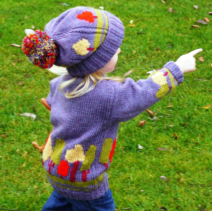 This Aran Sweater and Hat set featuring coloured Trees was designed after walking amongst the Autumn coloured trees in the Cotswolds, UK. It is a lovely time of the year and the trees are just an amazing rich colour.