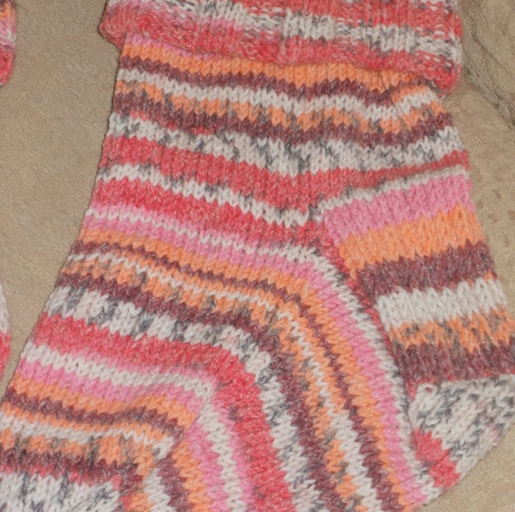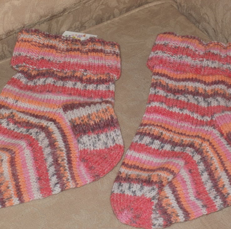 Lovely ankle length socks - knitted with a long cuff which makes them a bit slouchy. Ideal for anyone with circulation problems as there's no elastic to cut into you. Or just for lounging around in. Made on five needles, so no seams either. Fits up to a size 8 foot comfortably.