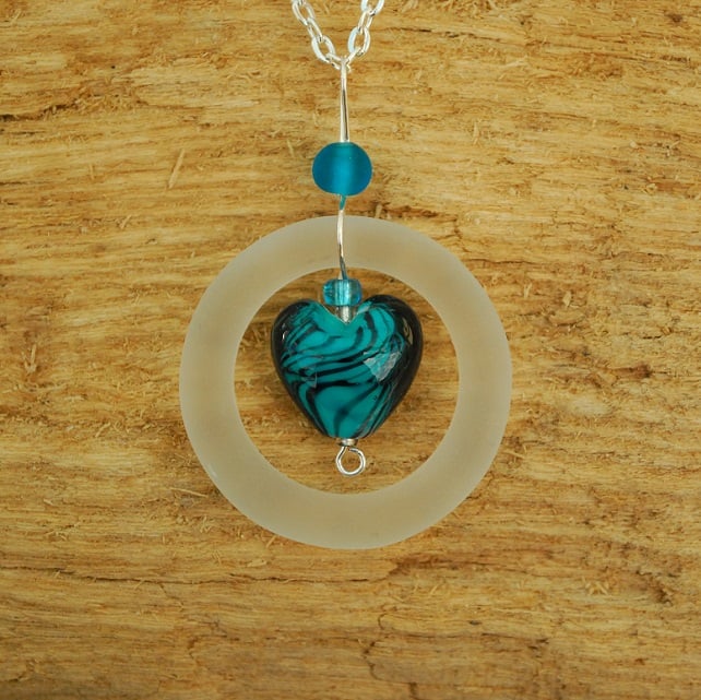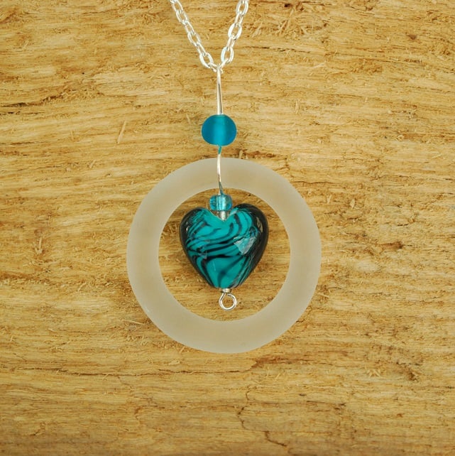 This gorgeous pendant has been made from the neck of an old bottle which we found on the beach. We have trimmed and tumbled the bottleneck so it is perfectly rounded and silky smooth. A special glass heart which is colourful and shiny, is framed by the bottleneck ring.