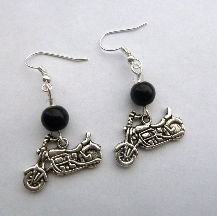A pair of silver plated earrings which feature black glass beads with antique silver motorbike charms.