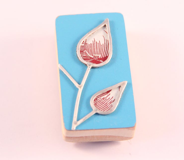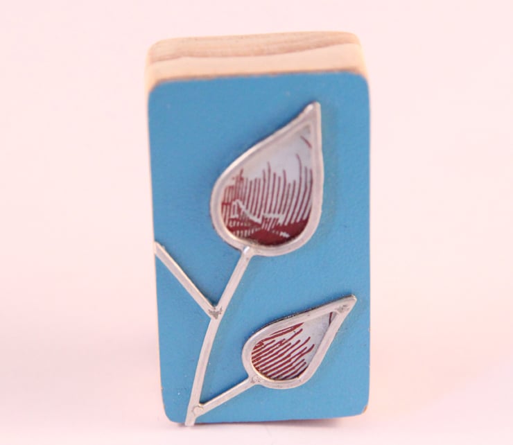 This Brooch is made form recycled Formica and wood. With a Silver outline for the leaf and the inside made from recycled tins.