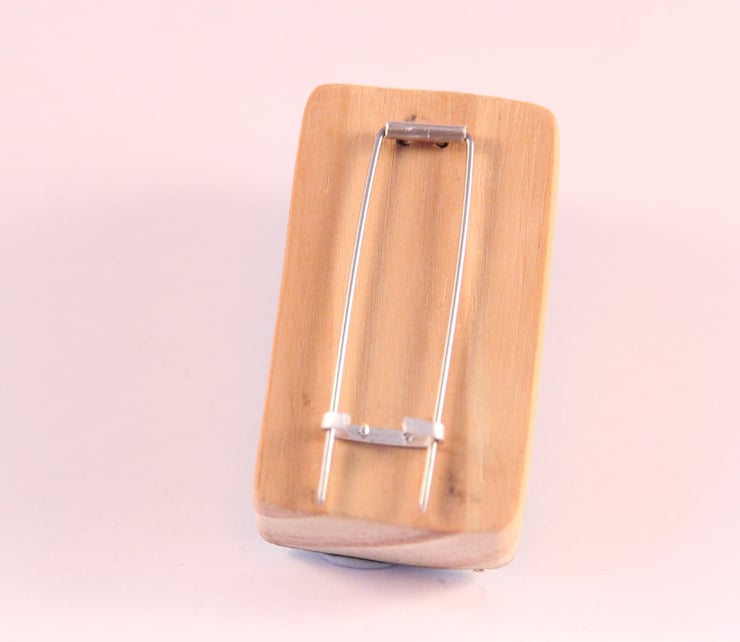 This Brooch is made form recycled Formica and wood. With a Silver outline for the leaf and the inside made from recycled tins.