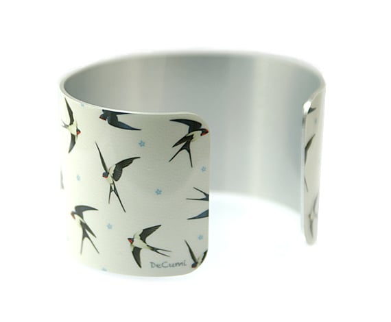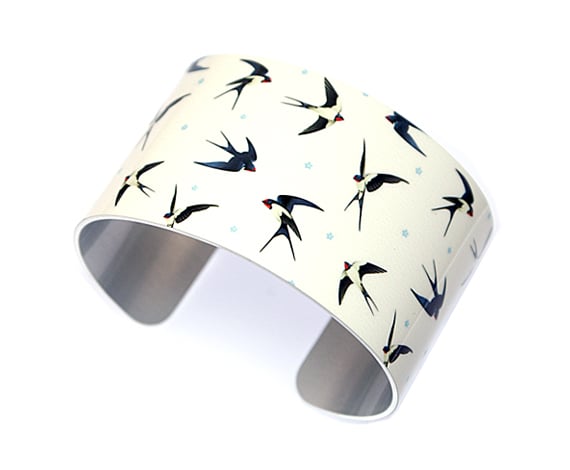 Cuff bracelet with graphically drawn swallows. Women's bangle with an off white background and black swallows. An ideal gift for a bird or nature lover. Handcrafted jewellery made in the UK