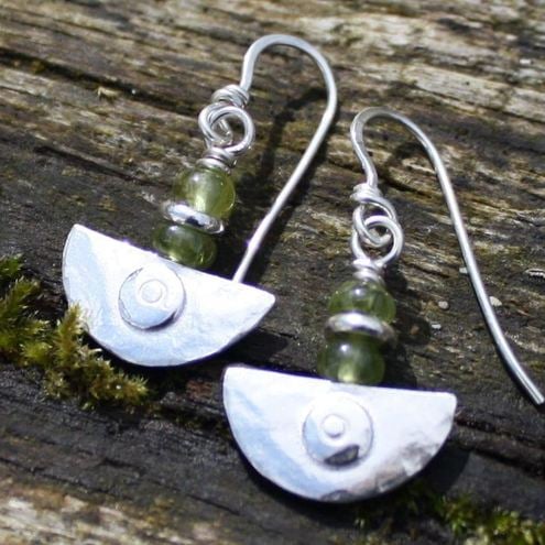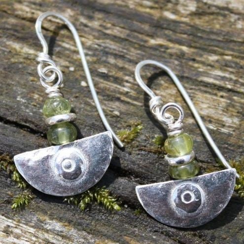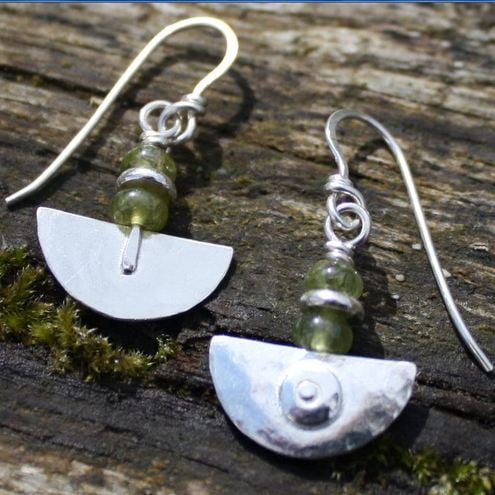 Sterling silver and peridot earrings. Fused and hammered for texture, then burnished to a subtle shine.