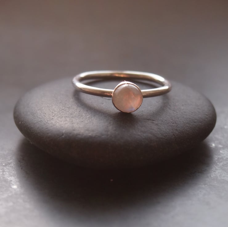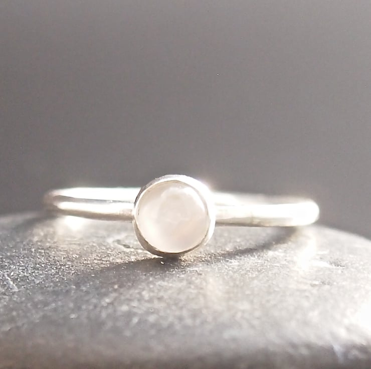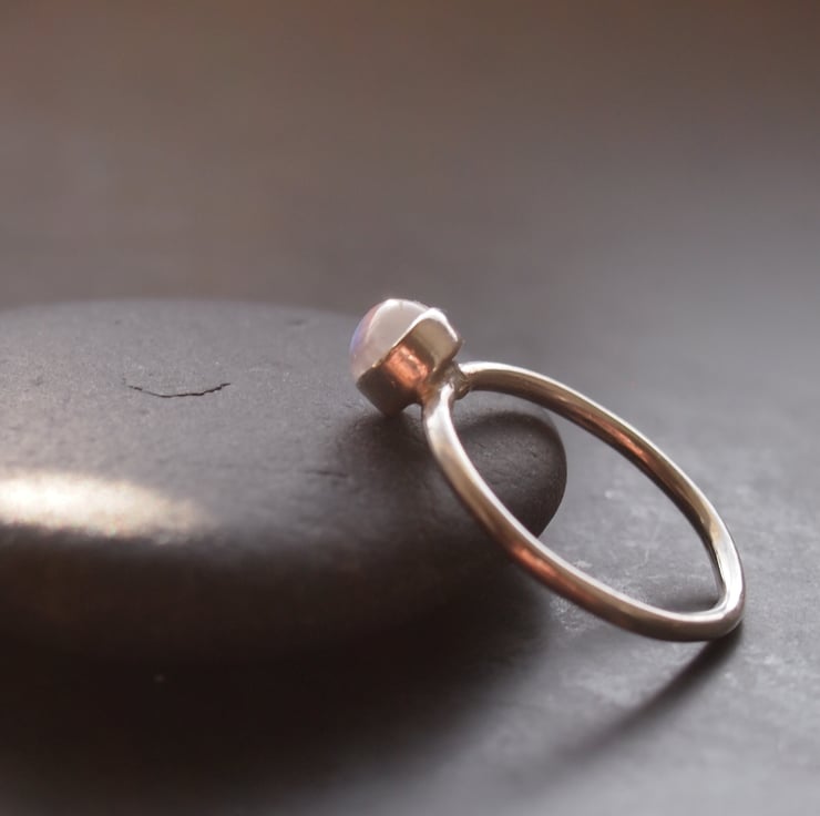 A shimmering round moonstone with a blue flash is simply bezel set onto a plain sterling silver ring 1.5 mm thick . Lovely worn alone or great stacked with other rings from our range.