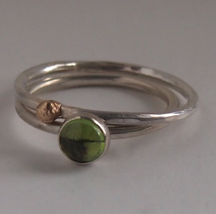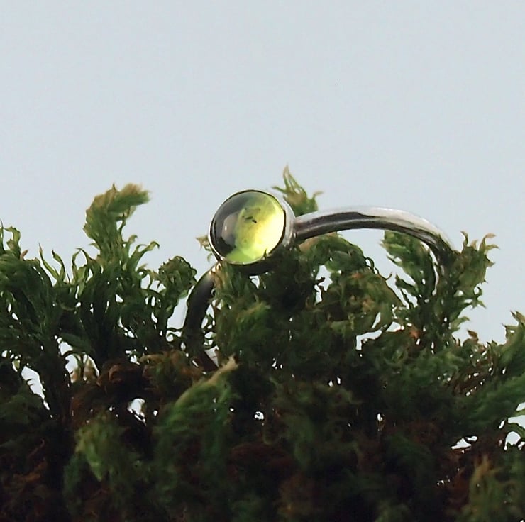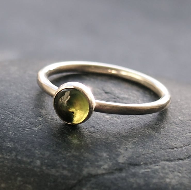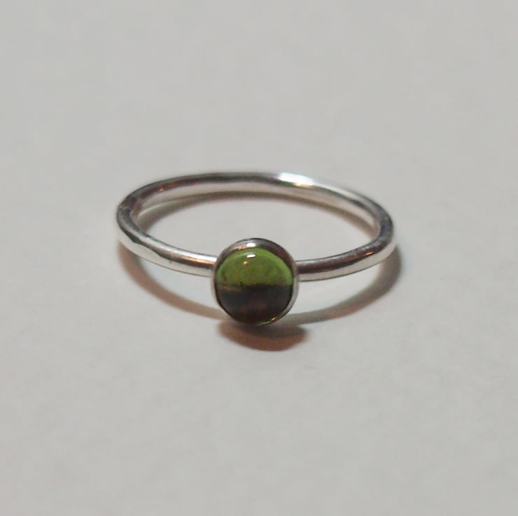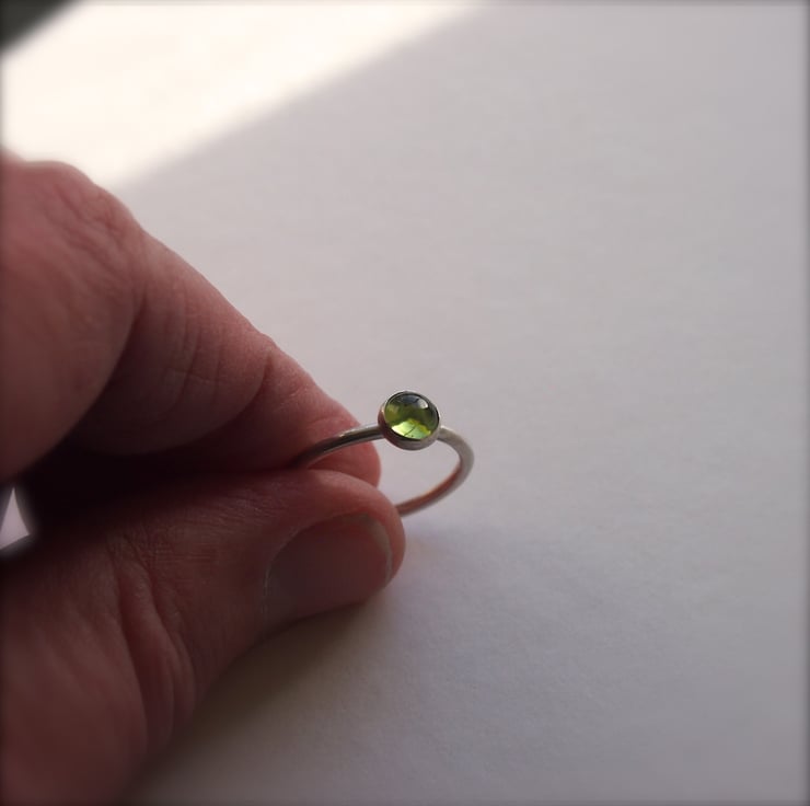 A grass green, vibrantly coloured peridot is simply bezel set onto a plain sterling silver ring 1.5 mm thick . The peridot is 5mm across.