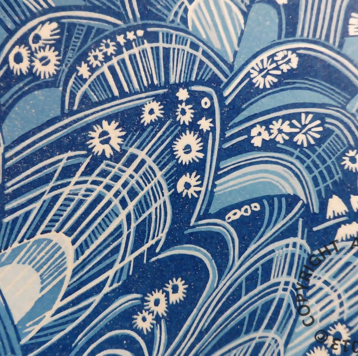 This is an original reduction lino print printed in three colours, pale blue-grey, sea blue and deep blue. A limited edition of 20. The printed area measures approximately 21x21cm. It is supplied in a white mount to fit a 30x30cm frame (other size available on request).