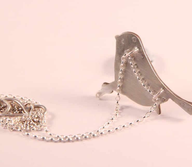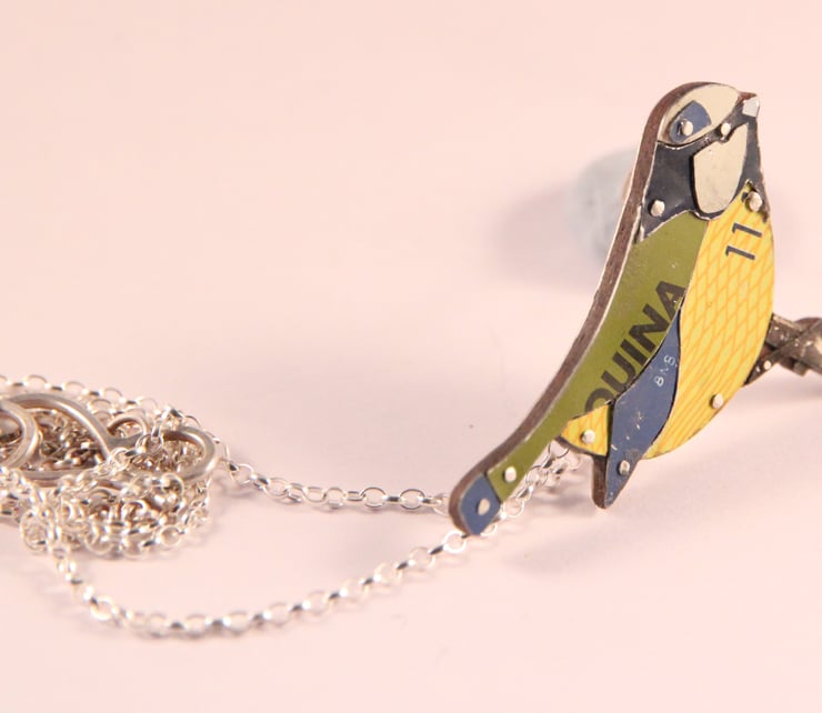 This Necklace is made by collaging old tins that I collect. Which means that each one is individual. I have a large collection of tins and sift through them all to find the right colours. I try and pick colours as close as possible to the bird. In this case a Blue Tit, which is blue green with a yellow breast. Each piece is cut out with my piercing saw and filed so it fits properly.