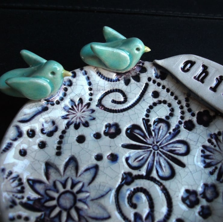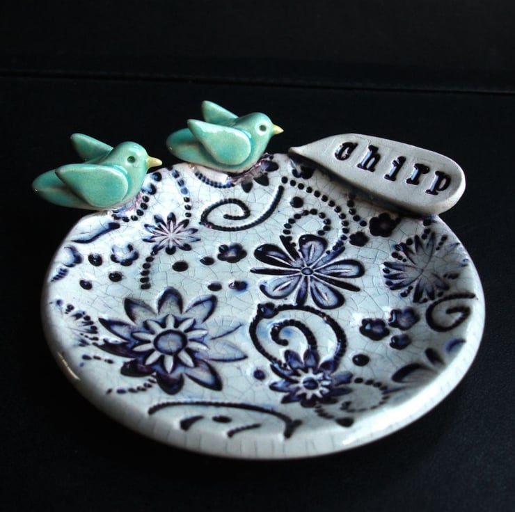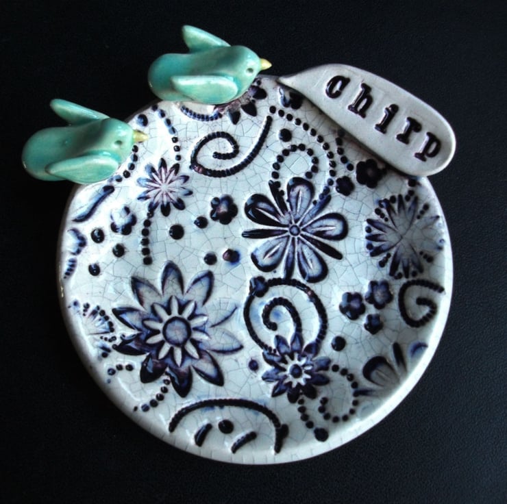 This cute little dish is made from white earthenware clay and decorated with a little blue birds and a speech bubble with the word chirp.