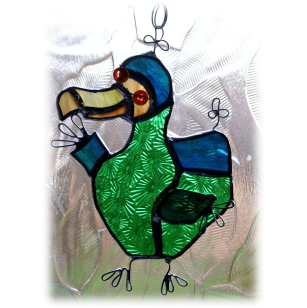 The beak is yellow and orange, the body green in textured glass to give a feathery effect and with teal highlights. I've used little beads for eyes and wire for the feet and hands.