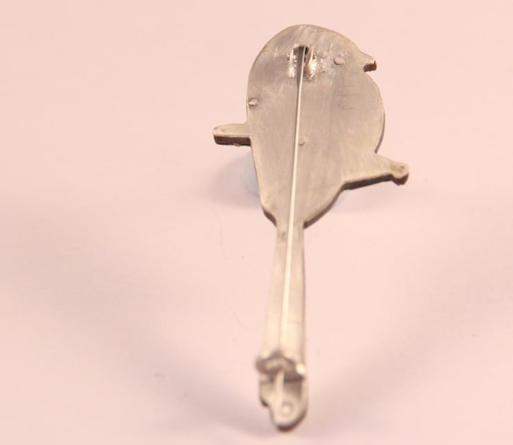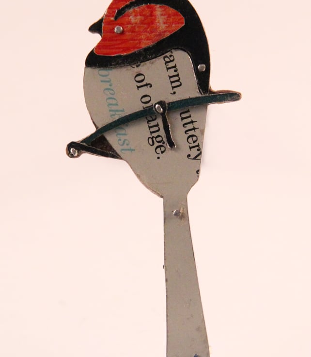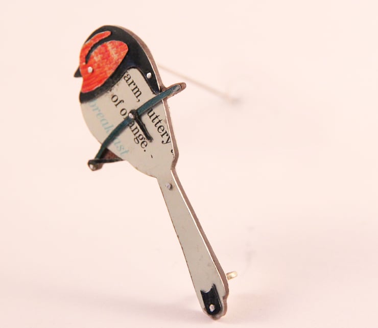 This Brooch is made by collaging old tins that I collect. Which means that each one is individual. I have a large collection of tins and sift through them all to find the right colours. I try and pick colours as close as possible to the bird. In this case a long Tailed Tit which has dusty pink cheeks with black strips and a dirty white body.