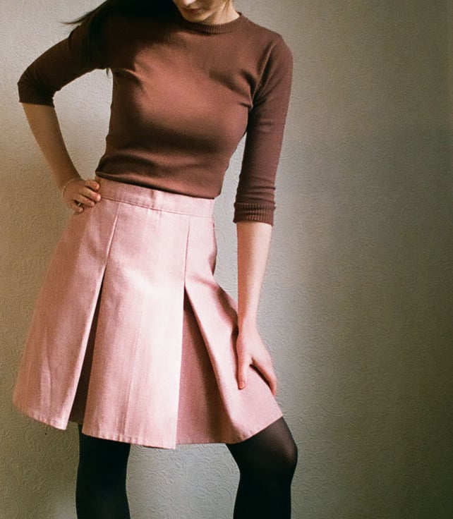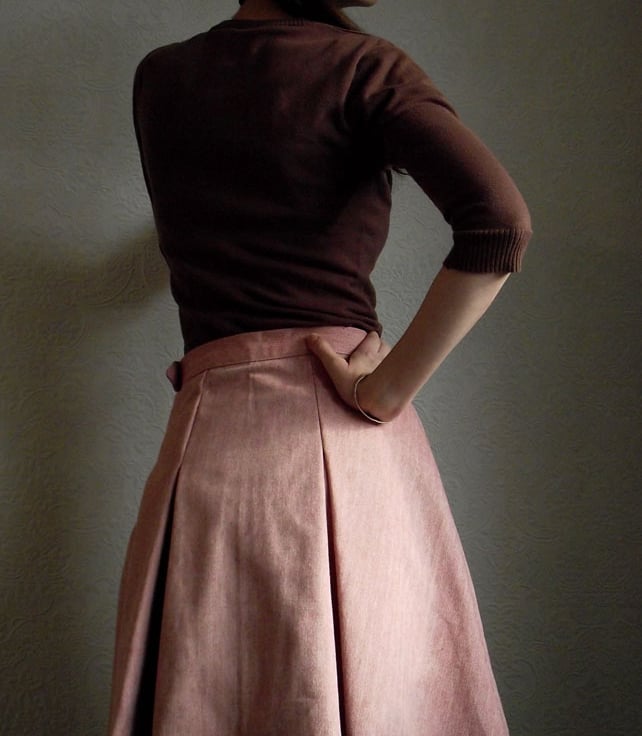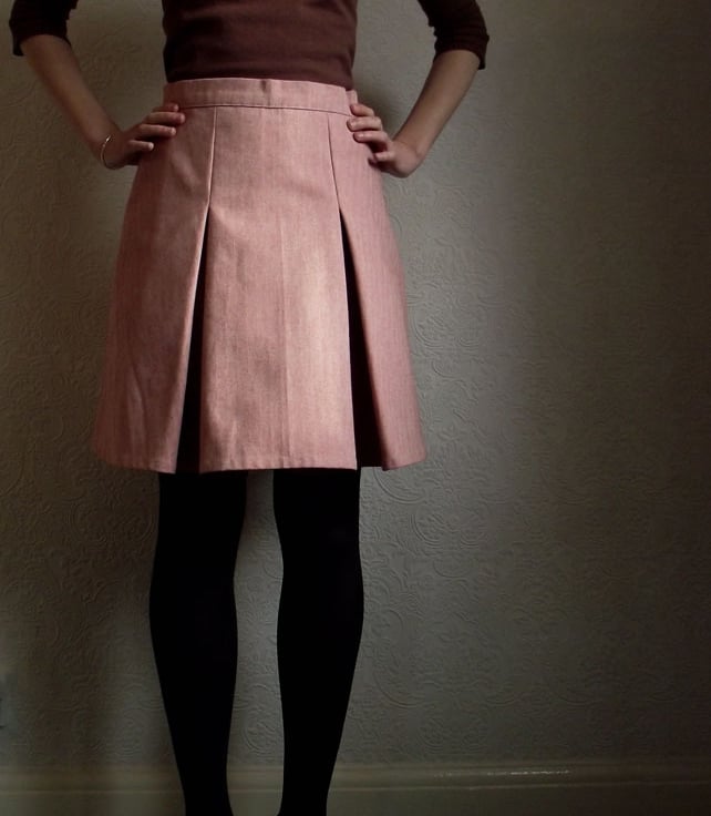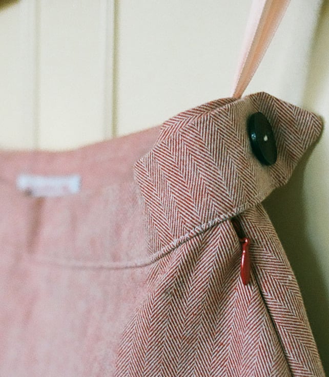 Handmade skirt with front and back pleats, side zip and decorative button concealing tack and bar fastening. Made of heavy denim in red and white with herringbone weave.