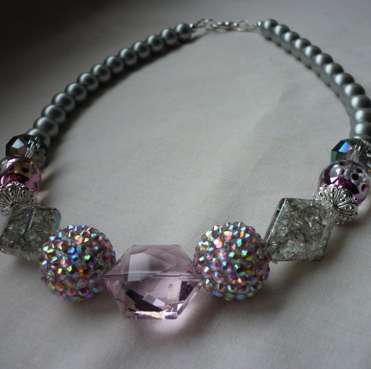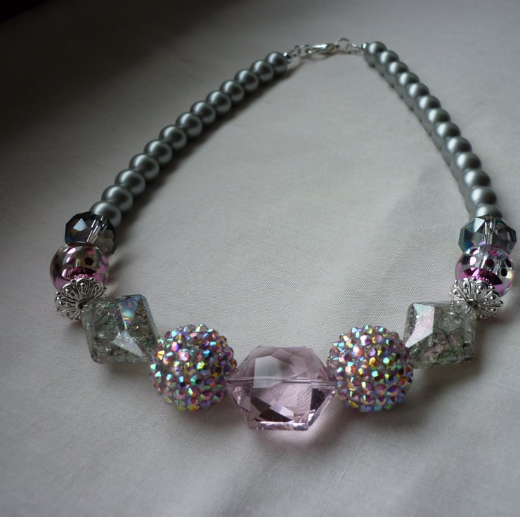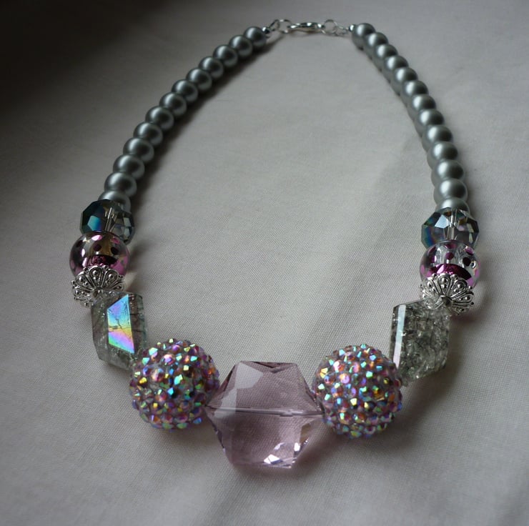 THE NECKLACE HAS BEEN MADE WITH A SELECTION OF SMALL AND CHUNKY GLASS, ACRYLIC AND METAL BEADS IN SHADES OF PINKS, GREYS, CRYSTAL, AB CRYSTAL AND SILVER ALONG WITH 12MM MATT SILVER GREY PEARLS AND FINISHED WITH SILVER PLATED LOBSTER CLASP AND FINDINGS.