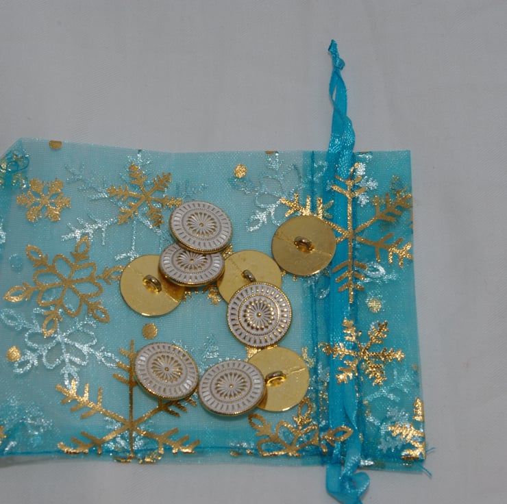 Nine beautiful metal buttons decorated in a raised pattern of gold and white on the front while the back of each button is a plain gold colour