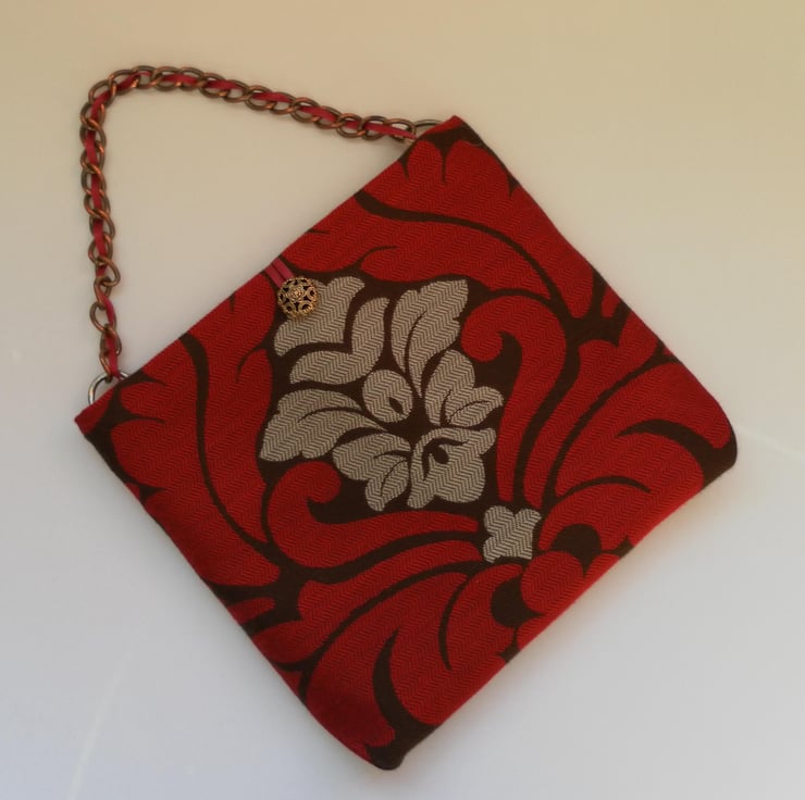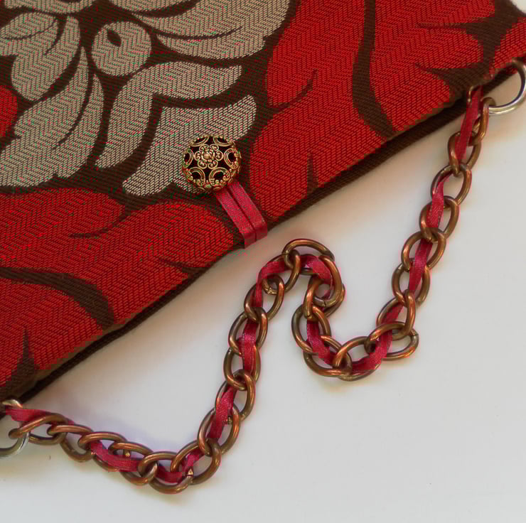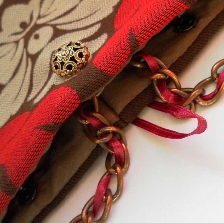 To create this bag I have folded the fabric to make the most of the bold red and silvery grey pattern. The bag is fully lined in brown and is lightly interfaced for structure. It has an ornate button and red ribbon loop closure and two simple press studs for added security. The bag has a short strap approximately 29cm long of coppery chain with more red ribbon threaded through it. The bag measures approximately 20 cm x 21cm.