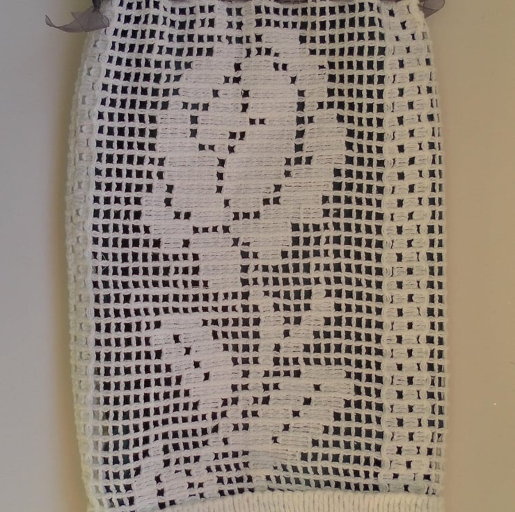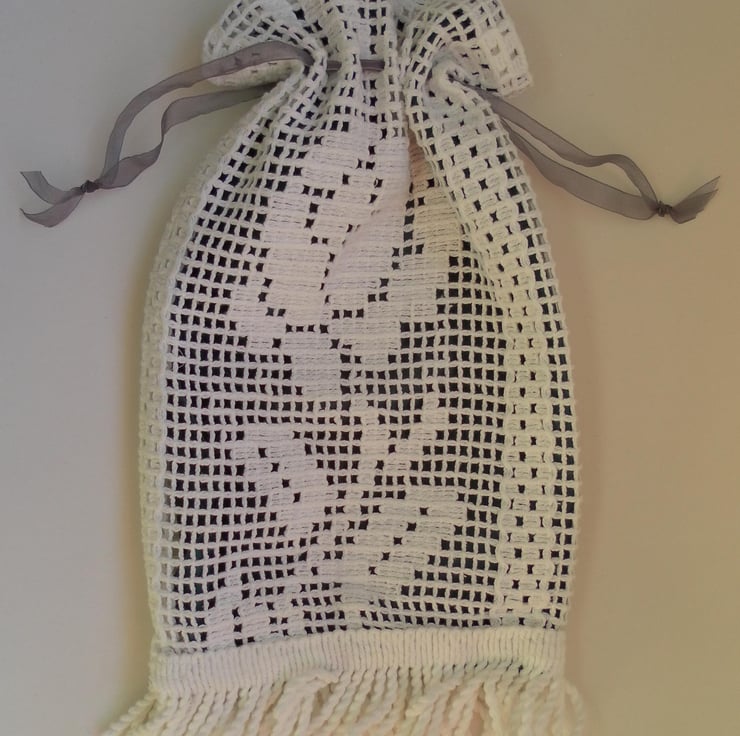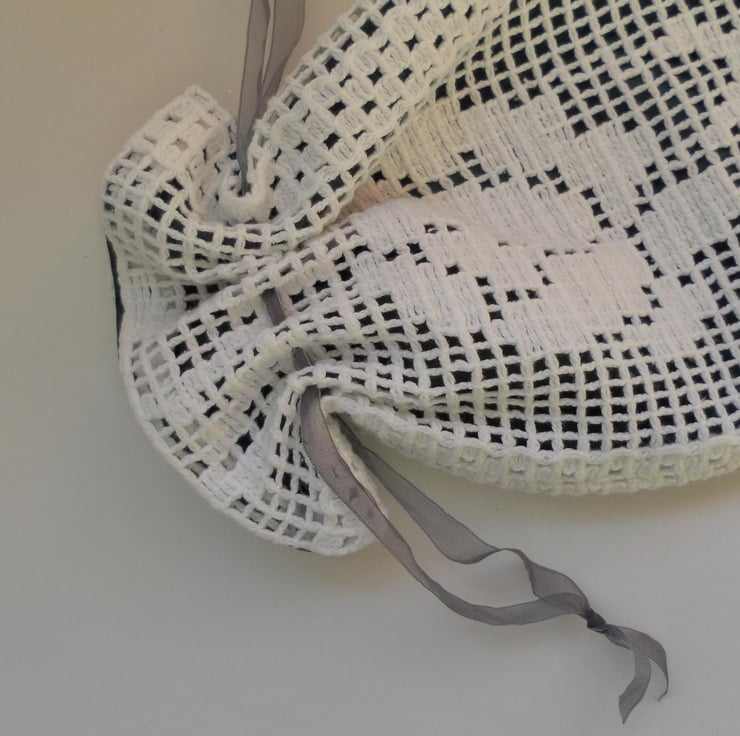 This lovely vintage inspired bag is one of a kind and would be unique to you. The fabric is off white and lacy with a fringe, over a dark jade satin fabric and fastened with two grey organza ribbon draw strings. The bag is approximately 16cm wide x 28cm deep.