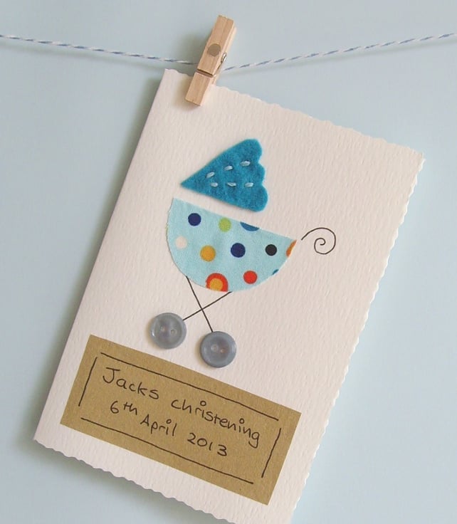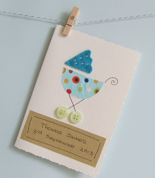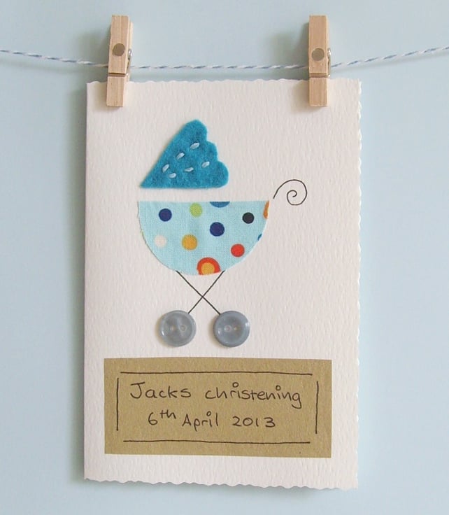 This handmade new baby card would celebrate the arrival of a new baby boy, a naming day or a christening.