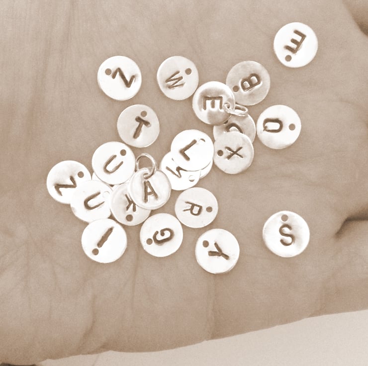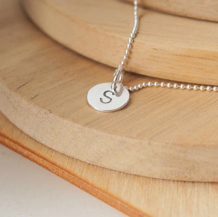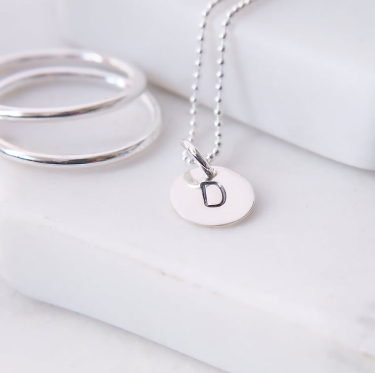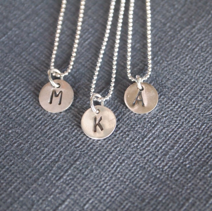 Any initial can be hand stamped onto these sterling silver discs to create a personalised charm necklace. Finished with a ball style chain in a choice of sizes.