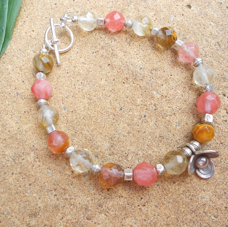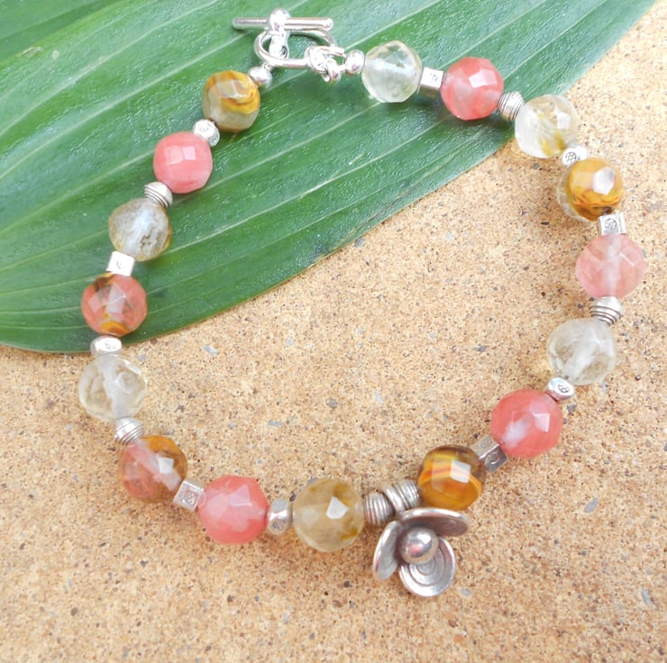 This is a lovely bracelet made from various pieces of hilltribe silver beads, including cubes bicones rounds and a focal flower bead. The glass beads are a mixture of faceted quartz, cherry quartz and rutilated quartz and lemon quartz. The bracelet measures 21cm (8.1/2") and is finished with a silver plated toggle clasp. (Hilltribe silver is made in Thailand, is purer than sterling at 99% silver which makes it softer and easier to shape and carve). As all of my items are individual pieces this is the bracelet you will receive. It will arrive gift wrapped in tissue paper, a organza bag and of course a padded jiffy bag.