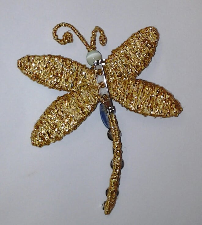 The Dragonfly measures approx 9.5cm long, and approx 7cm across and has a brooch pin attached to the back for fastening.