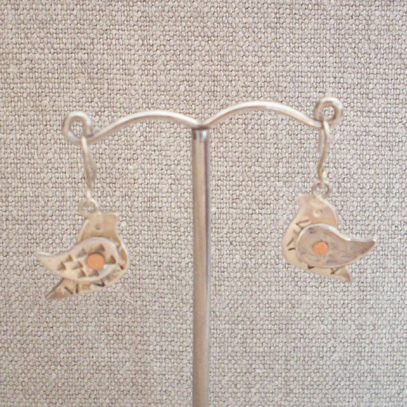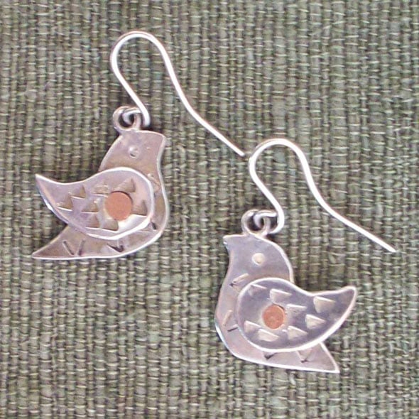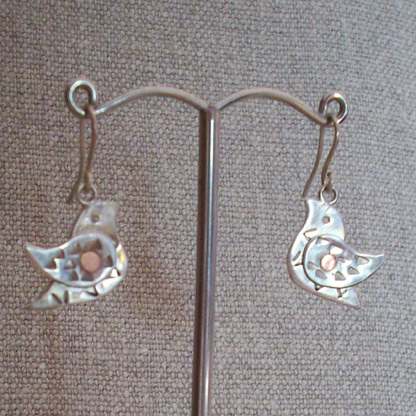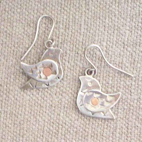 Pretty folk-art inspired earrings with the wing attached by a rivet for a change - the copper is a good colour contrast. These little characters are decorated by my handmade stamps. All sterling silver except the copper rivet, with sterling silver earwires. I always use Special Delivery as both buyer and seller are covered by this tracked and insured service. And it arrives the day after posting! Please contact me for non UK or multiple postage of my items as prices vary. Thanks for looking and for supporting hand-made.