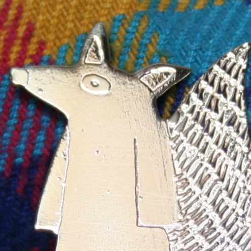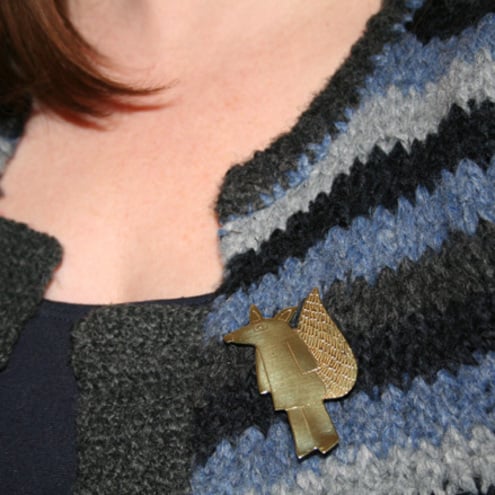 I made this from sheet brass, it has been etched and laquered and it has a safety catch soldered to the back.