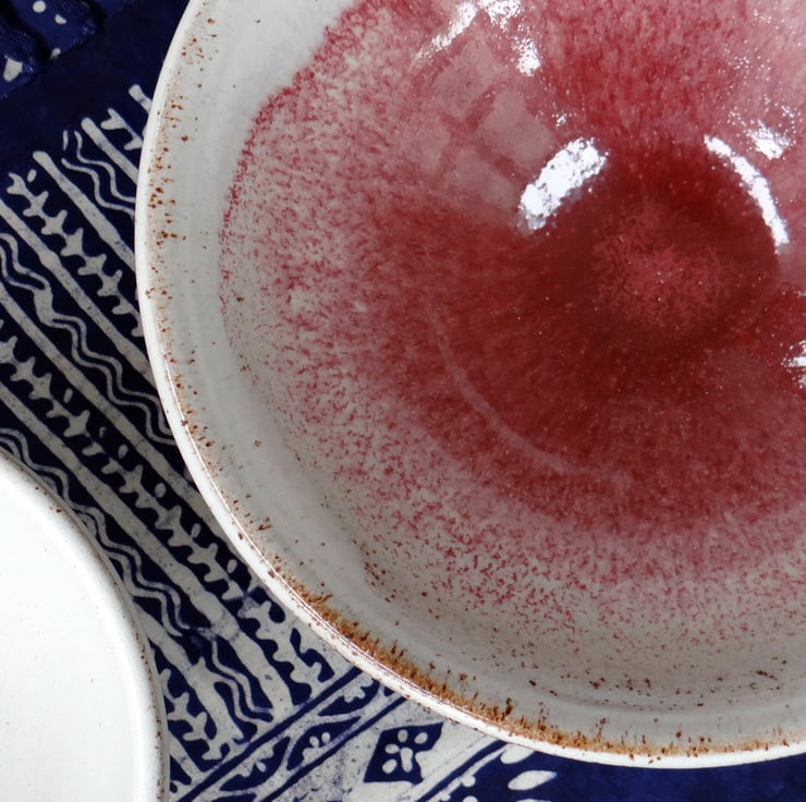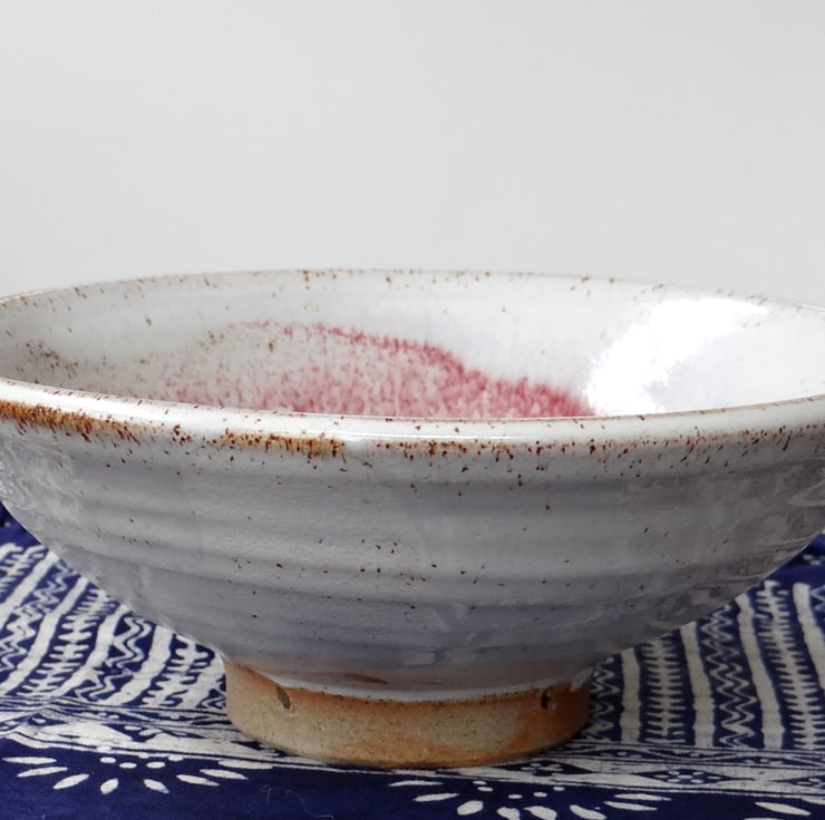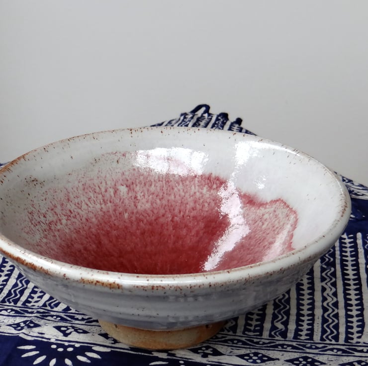 The glaze is unusual - reddish tones are hard to obtain in the kiln. The cerise centre is set off by the flecked white that covers both the rim and outside of the bowl.