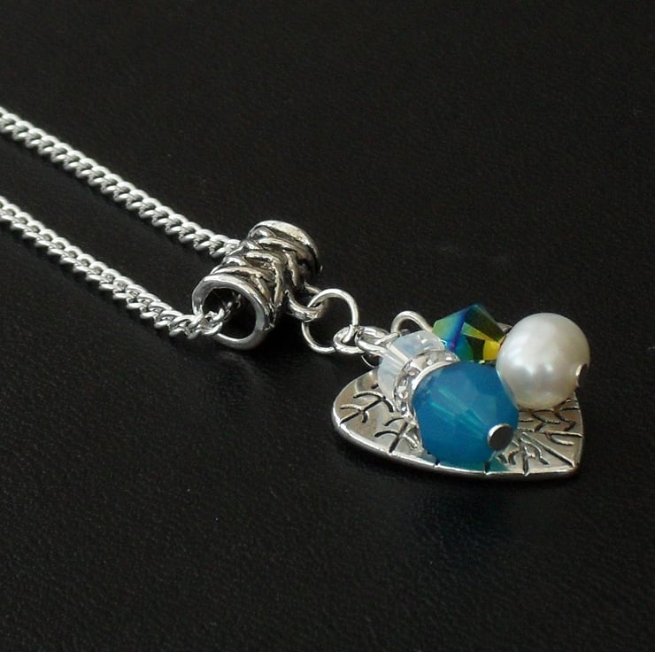 A beautiful crystal by Swarovski® in Caribbean Blue contrasts with a single white pearl in this tibetan leaf charm pendant necklace.