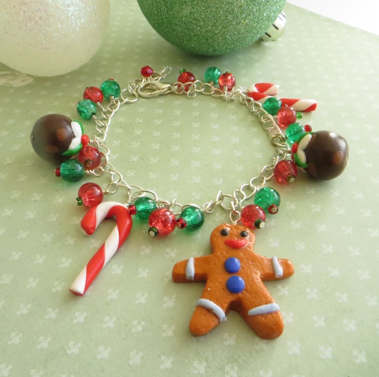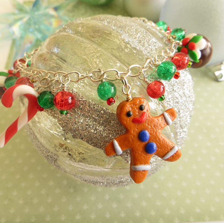 This Christmas bracelet features super sweet handmade polymer clay charms - a gingerbread man, two Christmas puddingss and two candy canes - and a selection of green and red glass crackle beads, carefully attached to a silver plated chain. Perfect for wearing over the festive season, or for anyone who looks forward to Christmas all year round!
