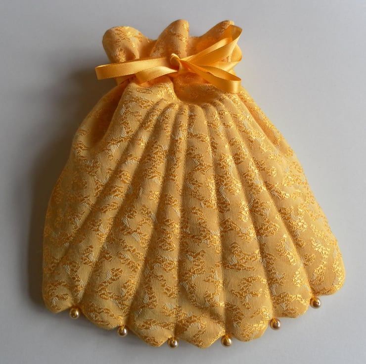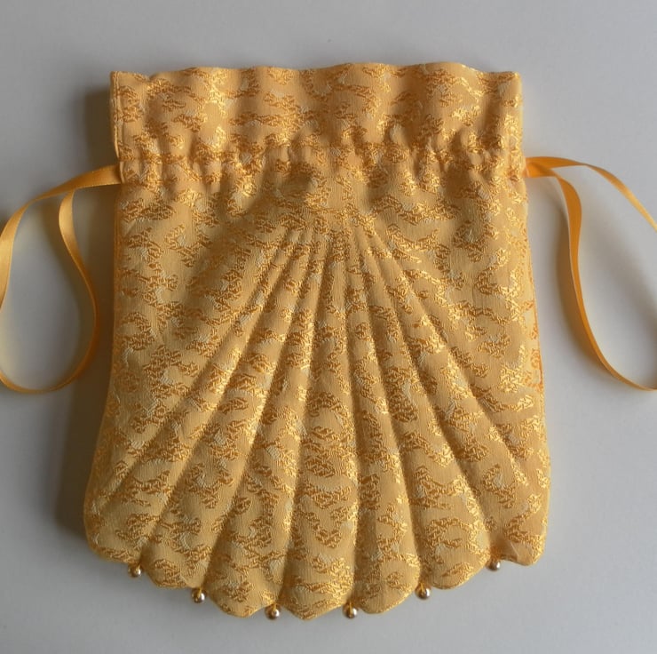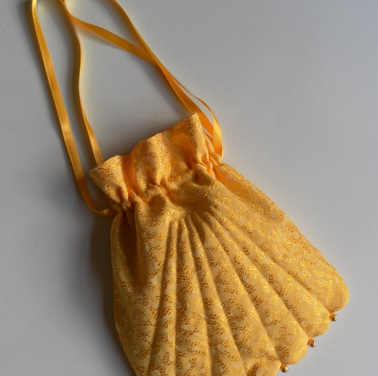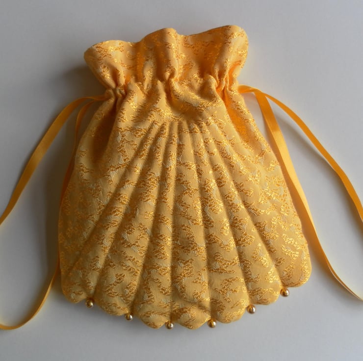 This beautiful, vintage inspired, shell shaped, evening or bridal bag is made from a fabric with a meandering, gold pattern on a plain golden yellow background. The bag is embellished with gold beads on the scalloped edge. The bag expands to open on a matching, double, satin ribbon drawstring. It is lightly quilted, emphasizing the lines of the shell and lined with gold china silk. The bag is approximately 17cm x 21cm.