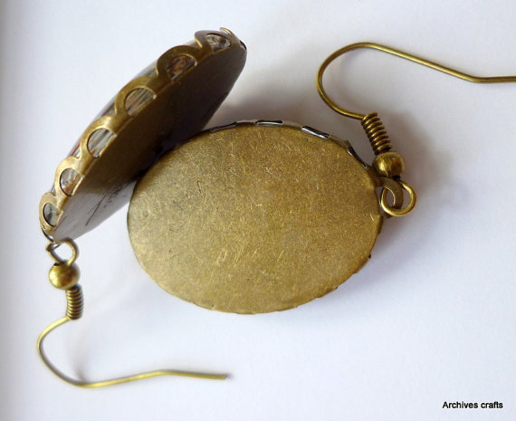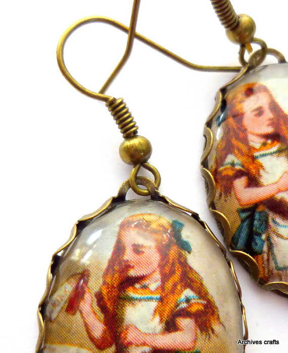 From the famous Alice in Wonderland story by Charles Dodson. Here are images of Teniels illustration of Alice captured in resin and finished with magnifying crystal glass domes. The pictures are set in antique bronze settings measuring 18 x 25 mm and hang from elegant gold plated hook wires which allow them to move and catch the light.