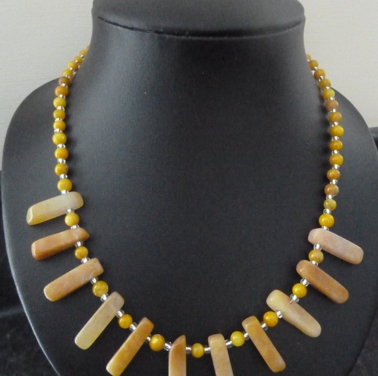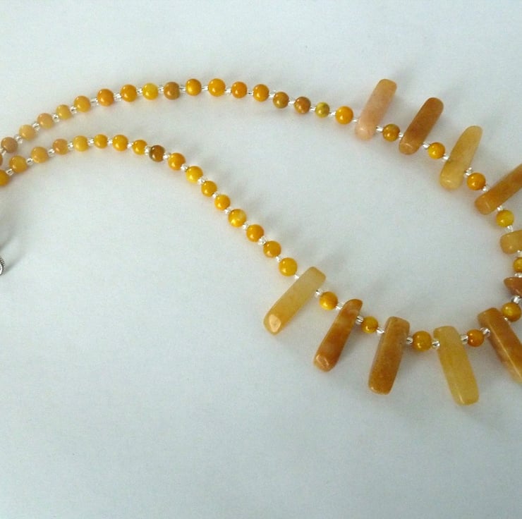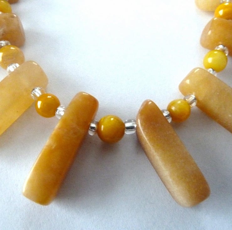 A necklace which i have made using yellow gemstone beads and yellow shell beads, it fastens with antique silver hook.