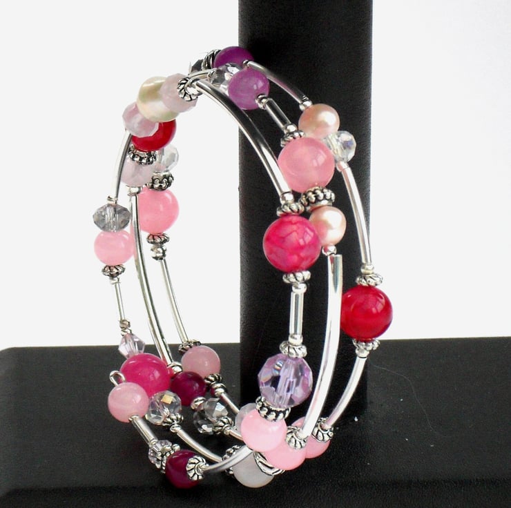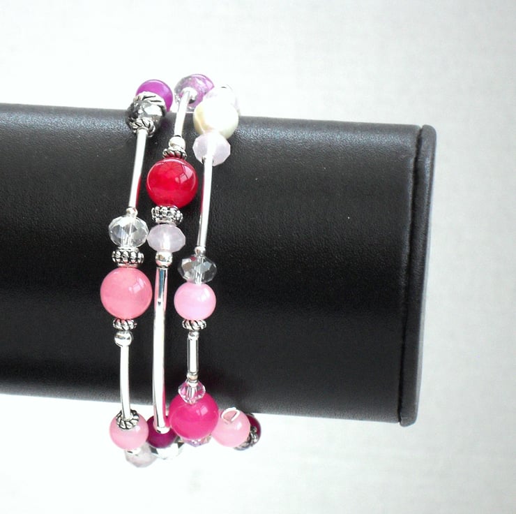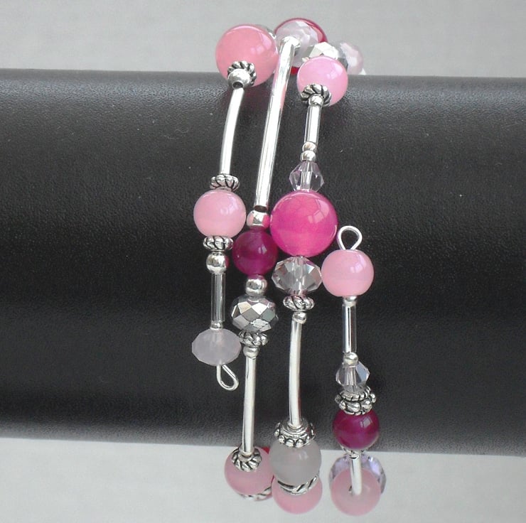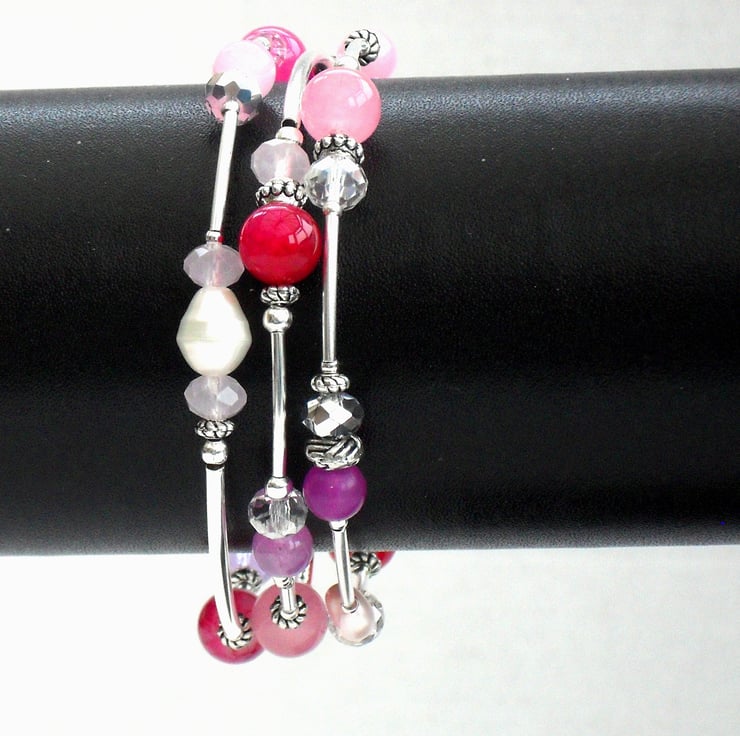 I have used a carefully selected mix of pink & lilac semi-precious gemstones, crystals, glass and pearls to make this truly unique bracelet.