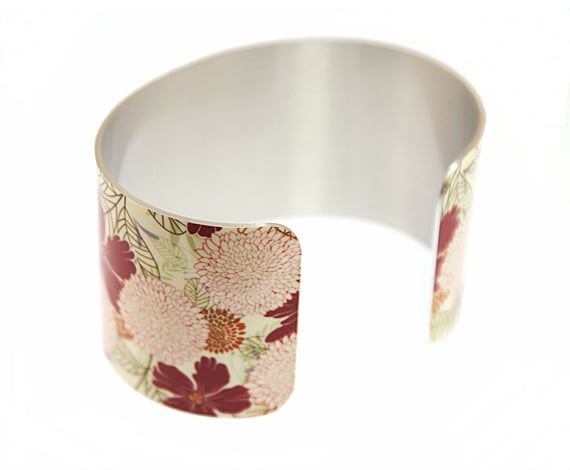 Cuff bracelet with hand drawn floral design. Metal bangle with cream background, pink and raspberry flowers. Modern women's jewellery, an ideal gift for a flower, plant or nature lover.