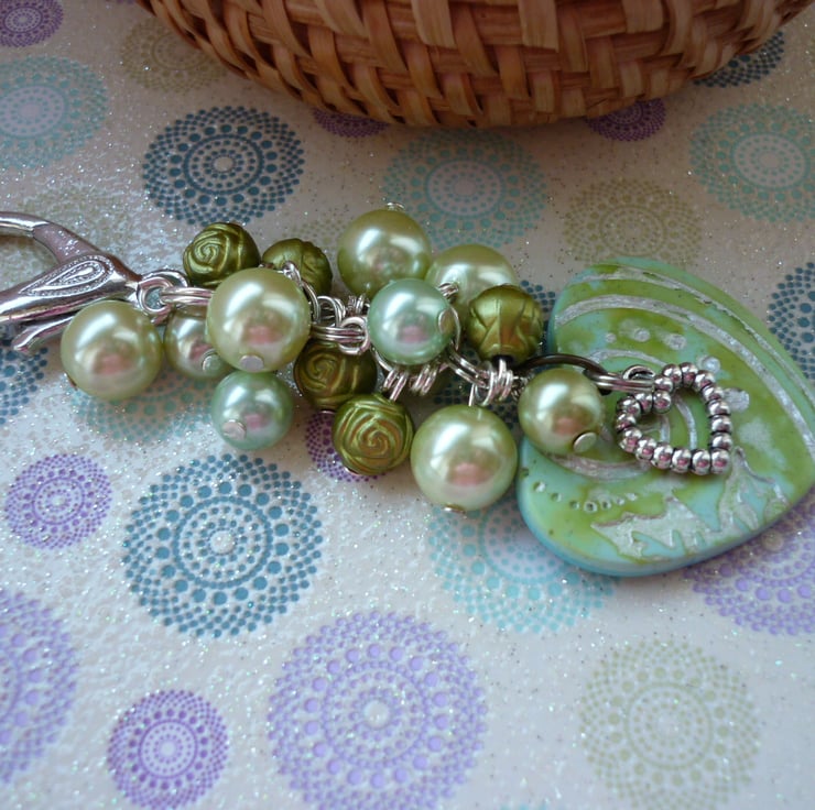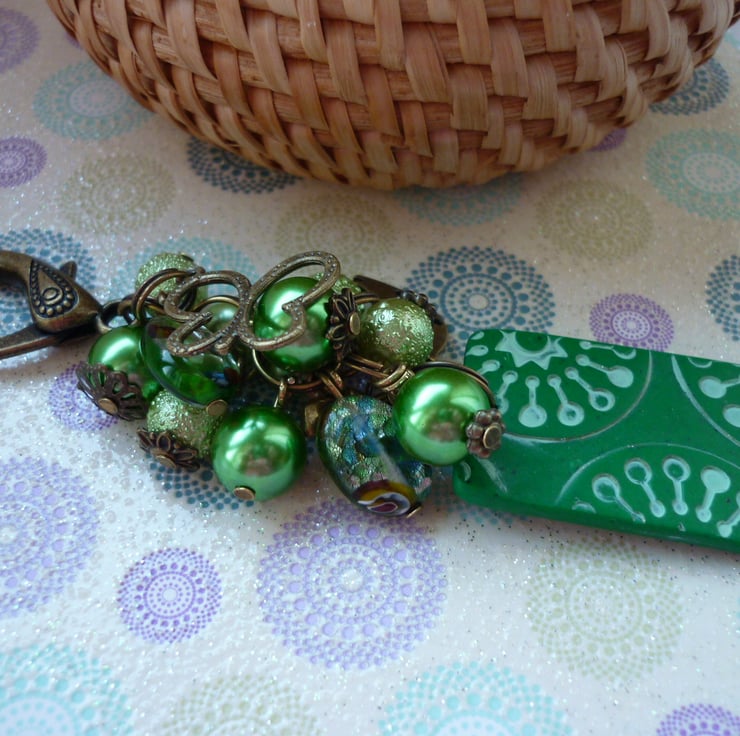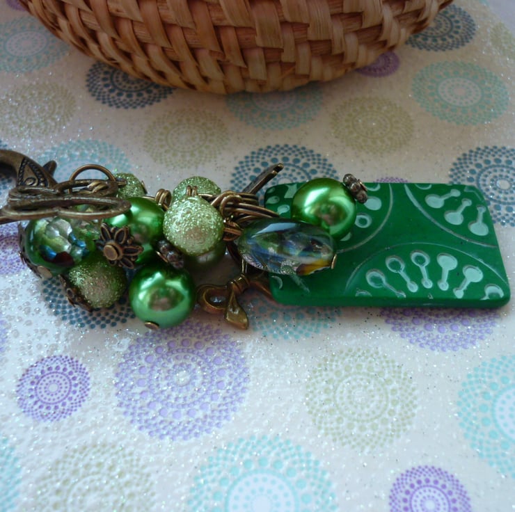 THIS HANDBAG CHARM HAS BEEN MADE WITH A SINGLE POLYMER CLAY OBLONG SHAPED BEAD IN SHADES OF DARK AND LIGHTER GREEN PATTERN WITHIN ALONG WITH A SELECTION OF PEARLS AND GLASS BEADS IN VARIOUS SIZES AND ALL IN SHADES OF DIFFERENT GREENS FROM LIGHT TO DARK SHADES AND ANTIQUE BRONZE BEAD CAPS, ANTIQUE BRONZE CHARMS AND FINISHED WITH A LARGE ANTIQUE BRONZE LOBSTER CLASP STYLE KEY RING.