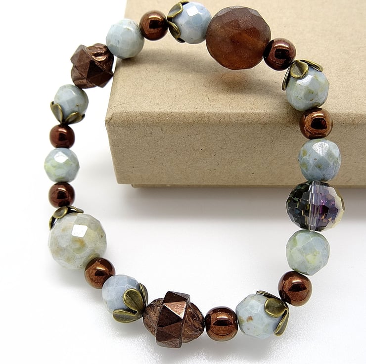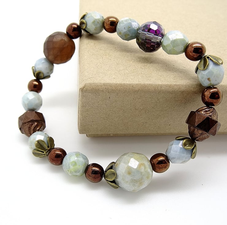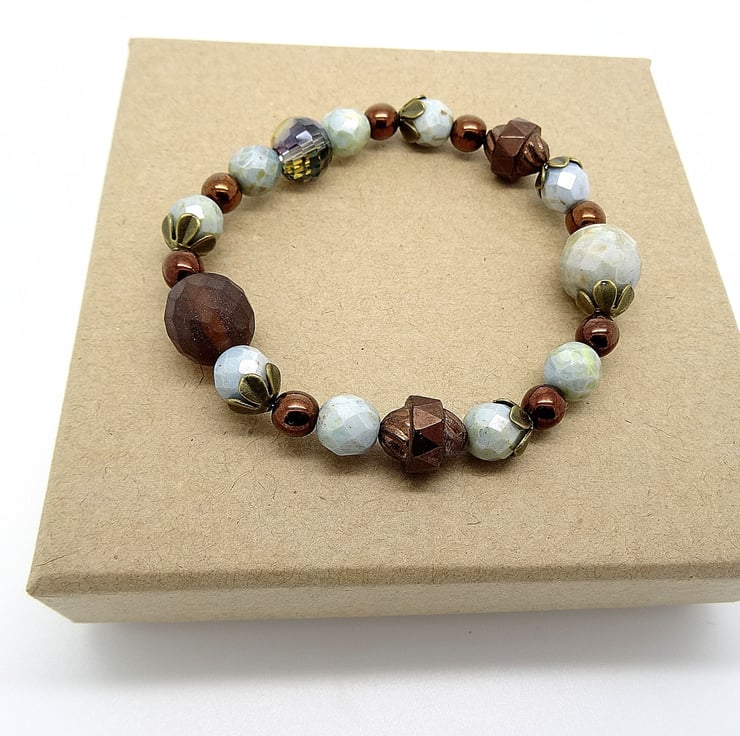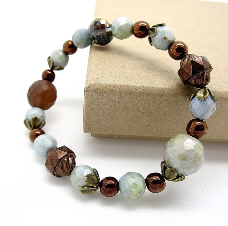 This is a lovely bracelet made from high quality czech glass beads. the colours are duck egg blue and bronze. The duck egg blue beads are faceted and there are bronze pearls and a couple of metal bicone beads along with antique bronze bead caps. The bracelet is stretchy so will fit most wrists. As all of my items are individual pices this is the bracelet you will receive. It will arrive gift wrapped in tissue paper and a organza bag.