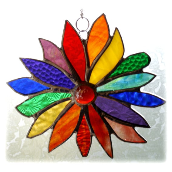 This is a stained glass suncatcher made using the Tiffany copper foil technique.