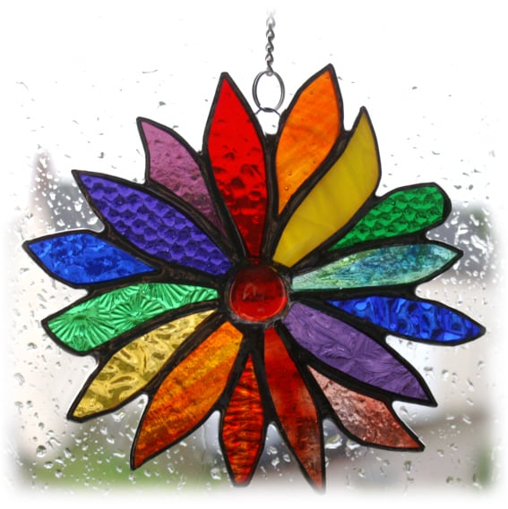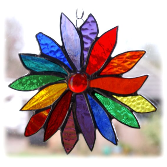 The flower has 16 petals, all slightly different shapes and the colours pass through the spectrum of the rainbow, twice. In the centre is a bright red glass nugget..